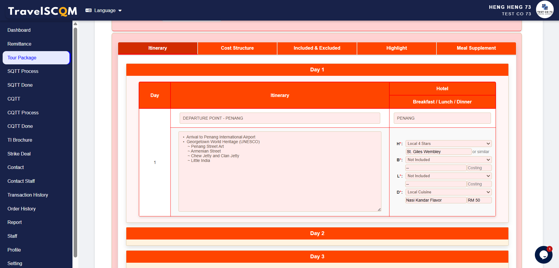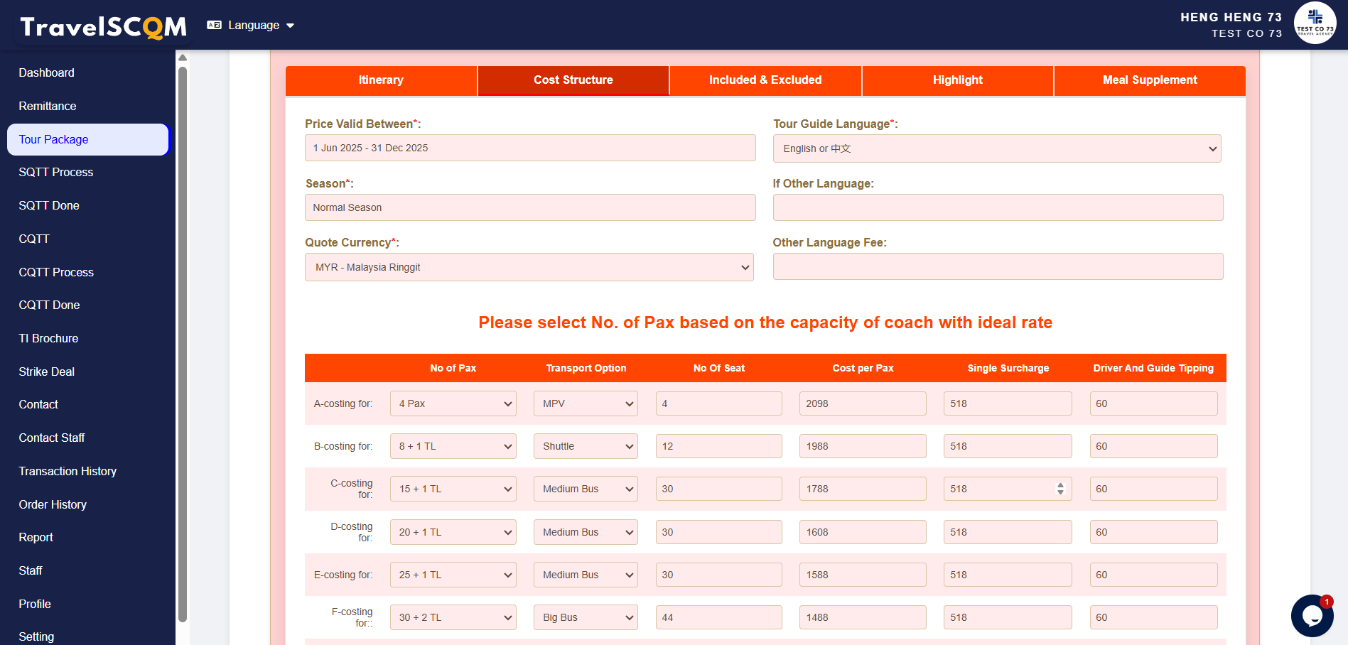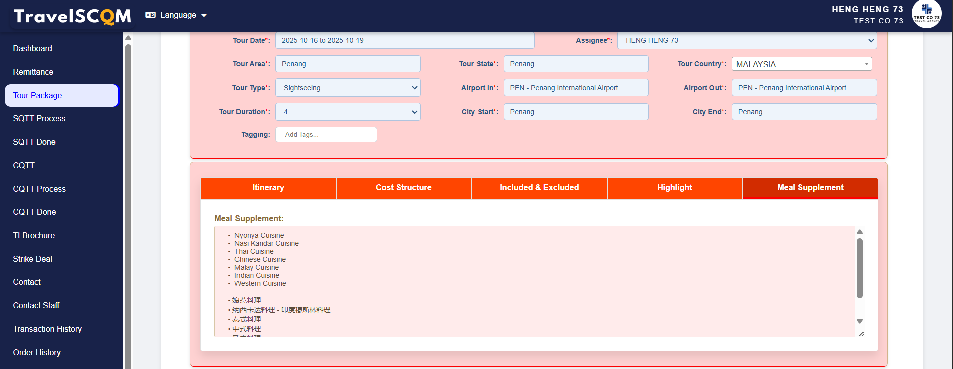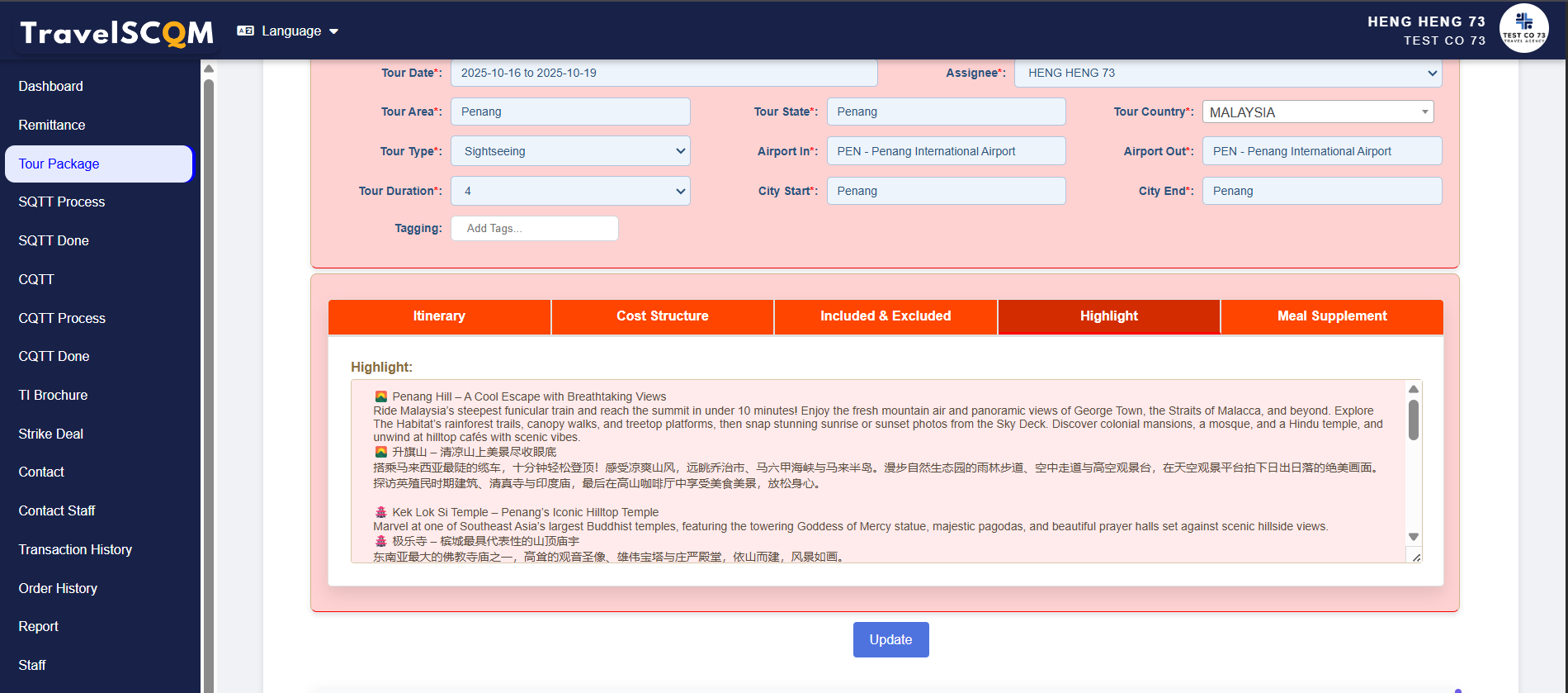 Once you've filled in all sections, remember to click Update to save your changes. This ensures your tour package is fully completed and ready to use or send out as a quotation.