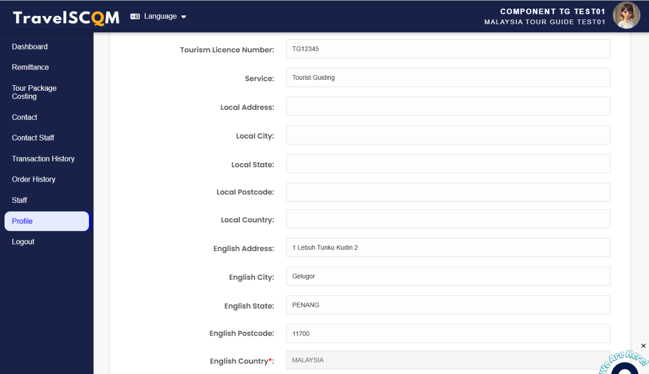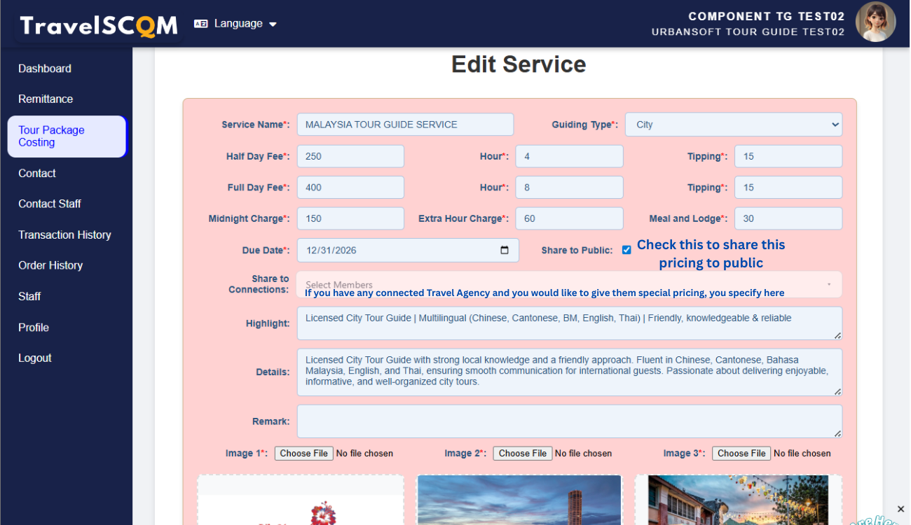 This module is intended for information-sharing purposes only and does not manage, assign, or confirm tour guide bookings. All arrangements related to tour guide services—including contact, negotiation, booking confirmation, service scope, fees, and terms—are handled directly between the travel agency and the tour guide. TravelSCQM is not involved in these arrangements and does not assume responsibility for any agreements made.