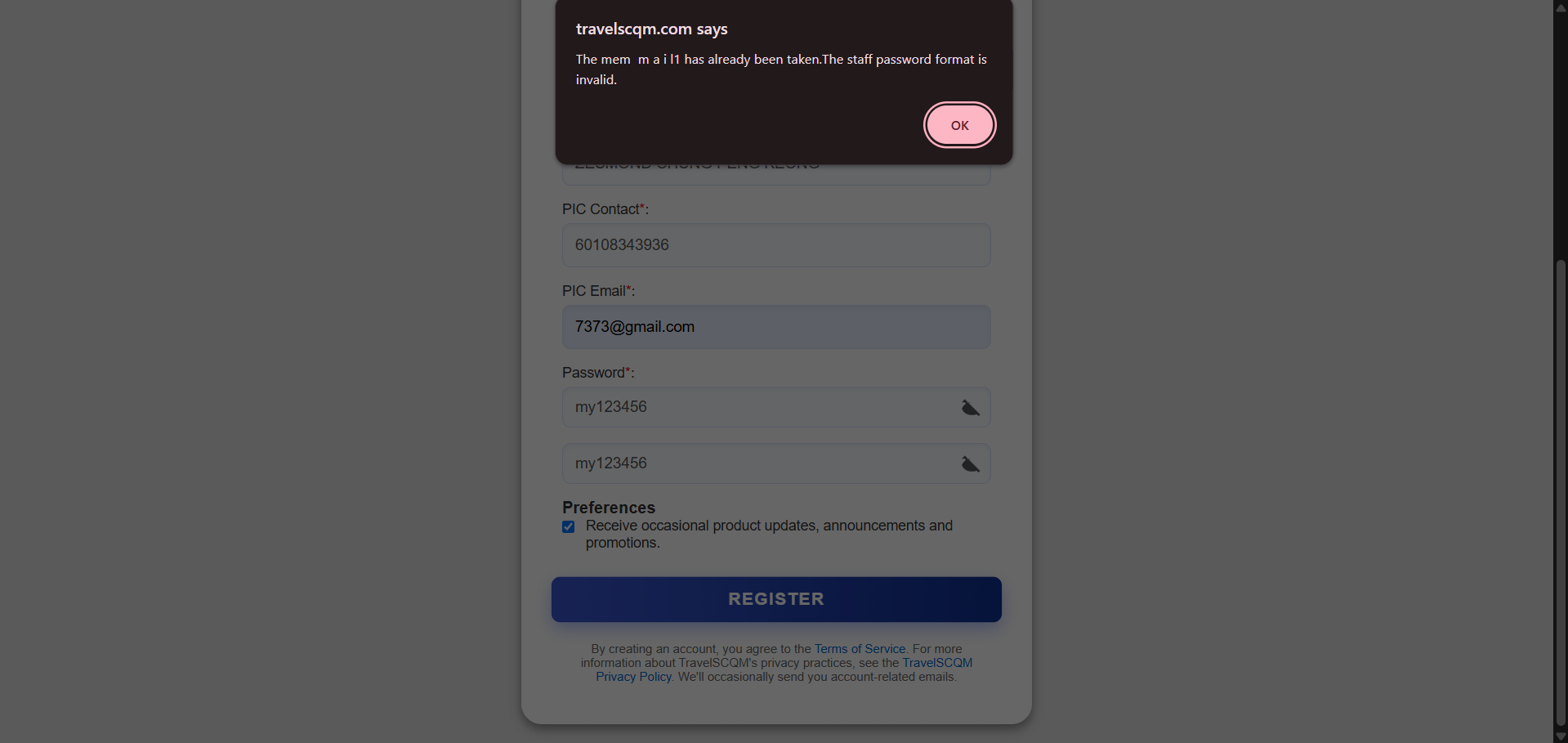 If you do not follow the password requirements, the system will not accept your password submission. This means you will unable to create your TravelSCQM account or update your password until it meets all specified criteria.